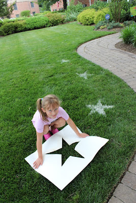 7. Vegyünk egy nagy lapot, újságpapírt, s vágjunk bele kedvünk szerinti mintát pl. csillagot, szívet, holdat. Terítsük a lapot a fűre, majd a sablonra szórjunk egy kis lisztet! :) Szerintem ez még gyerekzsúrra is szuper díszítésnek! :)